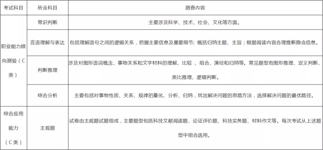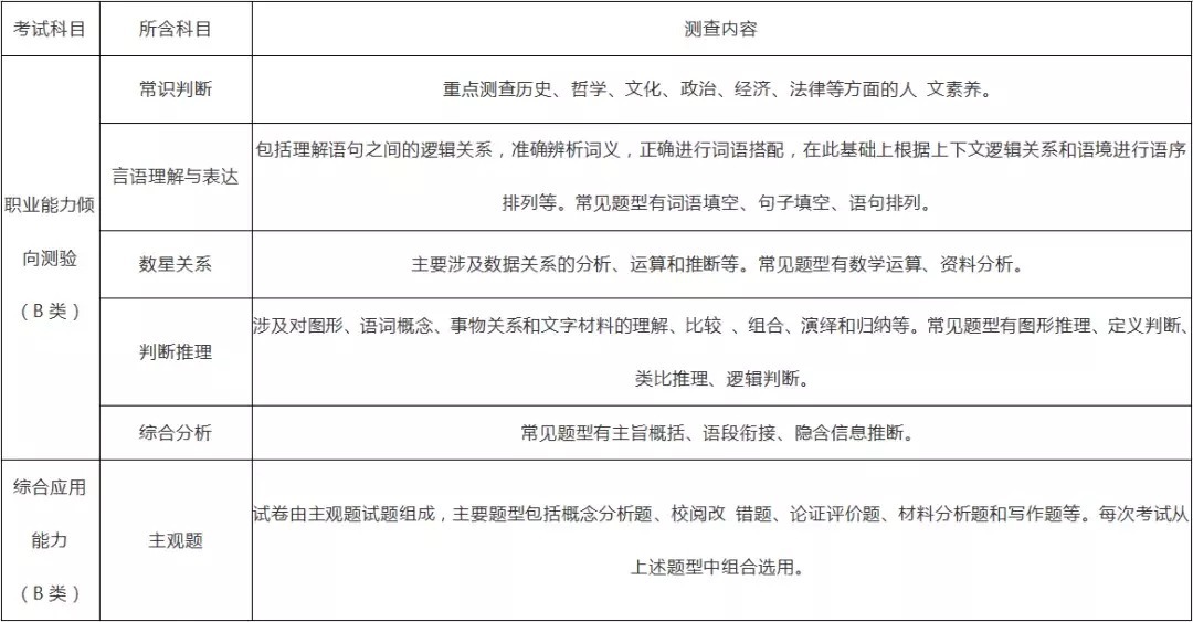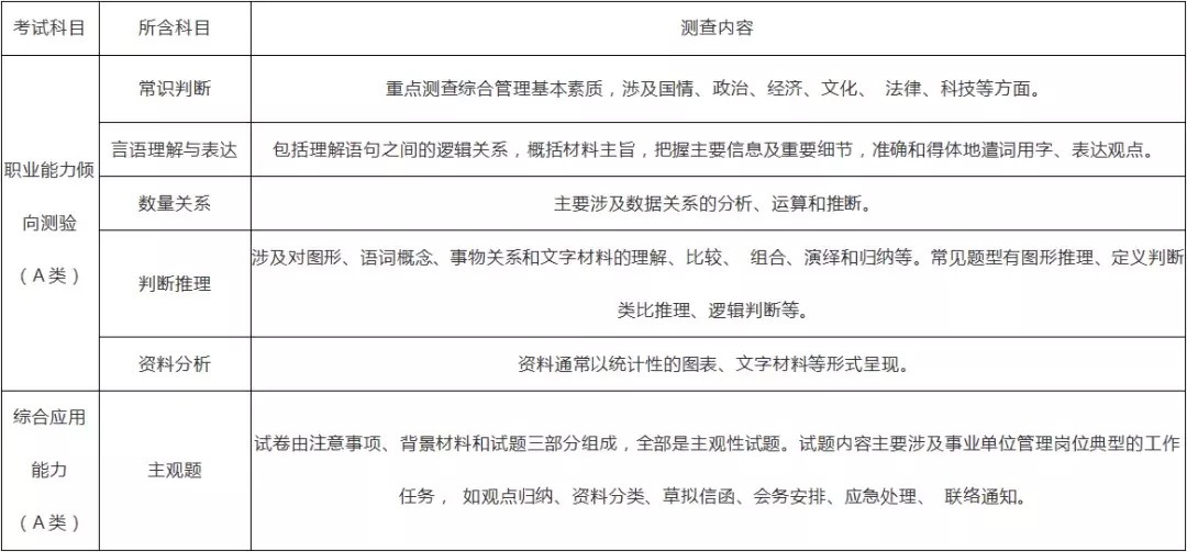 事业单位联考将公共科目笔试分为五类,分别为【A:综合管理类、B:社会科学专技类、C:自然科学专技类、D:中小学教师类、E:医疗卫生类】,统一考核《职业能力倾向测验》和《综合应用能力》两科。而根据类型的不同,尽管同属一科,内容也会有所区别。事业单位联考笔试科目、考试时间及分值:①《职业能力倾向测验》考试时限为90分钟,满分为150分;②《综合应用能力》考试时限为120分钟,满分为150分。